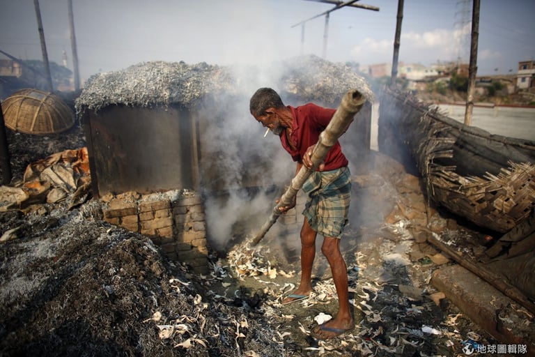 工人正忙著把剩下的加工皮革做成家禽的飼料,一旁是汙染嚴重的布里加納河。近日孟加拉的總理就警告,如果達卡地區的皮革廠不遷址會對環境形成嚴重的衝擊。