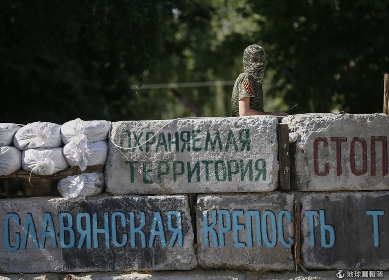 親俄派的民眾站在障礙物旁,烏克蘭東邊城市斯拉維揚斯克仍不斷傳出槍響,烏克蘭軍方和當地的親俄份子發生嚴重衝突對峙。