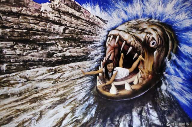 遊客開心地趴在3D立體畫前拍照,新加坡的「聖淘沙名勝世界」渡假村(Resorts World Sentosa)的新設施「3D立體美術館」(Trickeye Museum, 又翻為特麗愛 )會在星期天時正式開幕,這座美術館就是以各種千奇百怪的立體幻覺畫作聞名。