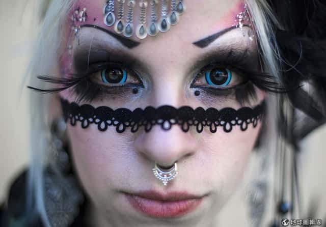 德國萊比錫再度舉辦有名的「哥德潮流大會」(Wave-Gotik Treffen),照片中的女子為了參加這場盛事,特地用精緻誇張的化妝打扮自己。