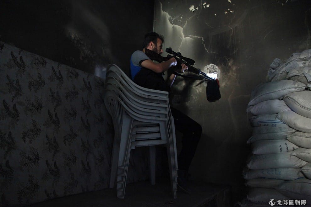解放敘利亞的反政府組織士兵,正拿著槍枝瞄準街道。