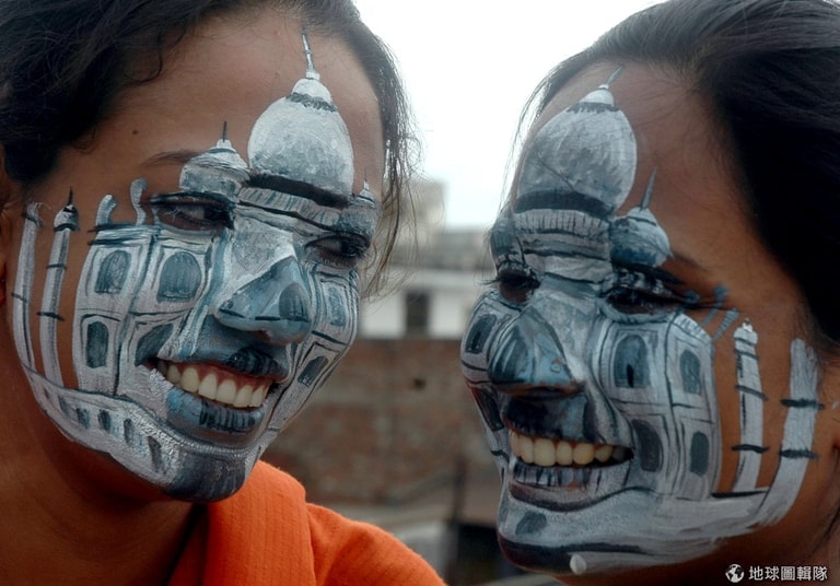 女孩的臉畫上了白色的泰姬瑪哈陵。