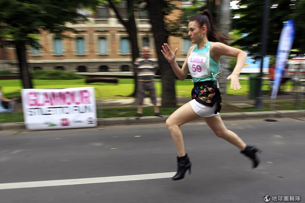 參加「高跟鞋路跑」(Stiletto Run)的參賽者手刀奔過賽道,羅馬尼亞首都布加列斯特舉辦了特別的路跑活動,參賽者必須穿著鞋跟高度在7公分以上的鞋子跑過50公尺的距離。這場賽事主要是為了喚起大眾對卵巢癌的重視。