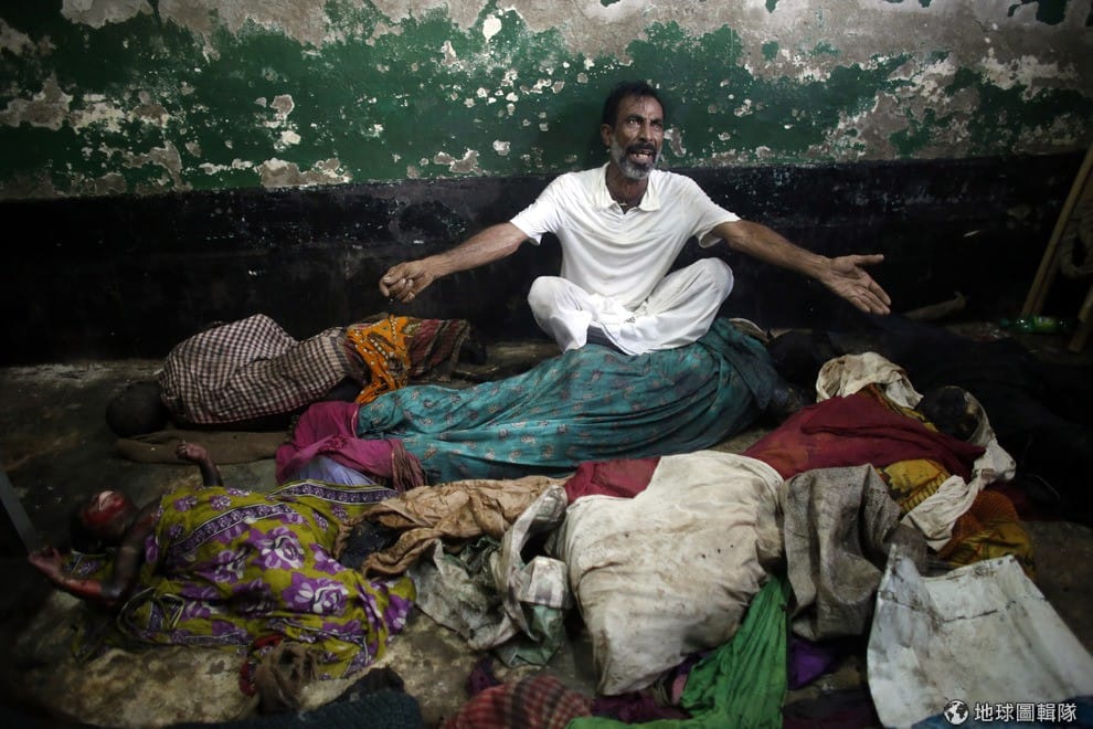 民眾悲痛的坐在自己喪生親友的遺體旁。孟加拉日前舉辦宗教慶典Shab-E-Barat,但因為慶祝的煙火意外燒到民房引發大火,釀成至少9人死亡,30多人受傷。