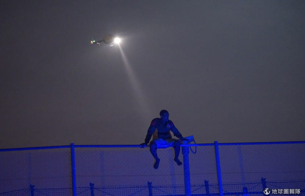 從非洲來的非法移民坐在摩洛哥和西班牙屬地美里拉之間的鐵網上,他和其他移民想偷渡進入美里拉,但最後仍被巡警抓到趕回摩洛哥。