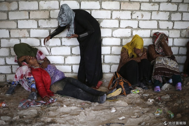 一位移民忙著幫累倒又脫水的女性搧風,他們是來自非洲撒哈拉以南地區的民眾,原想偷渡進利比亞之後再轉進歐洲地區,但最後在利比亞北邊被逮到。