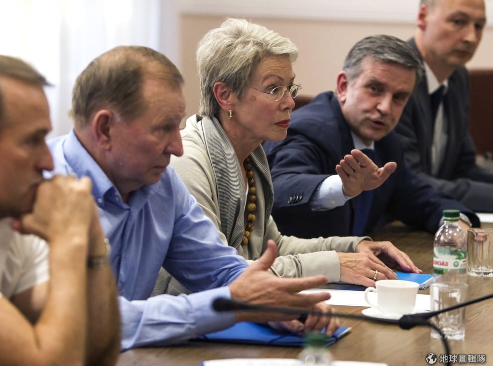 和平會談上,俄國大使祖拉伯(右二,Mikhail Zurabov)、擔任調解人的前烏克蘭總統庫奇馬(左二,Leonid Kuchma),以及來自歐洲安全暨合作組織(OSCE)的調解人塔莉亞維尼(中,Heidi Tagliavini)。
