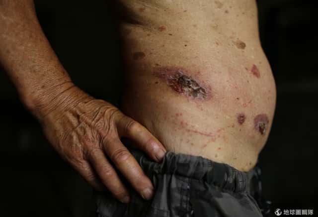 照片中是69歲的鞏昭元(音譯, Gong Zhaoyuan)先生,他正在給記者看他身上的皮膚潰瘍。