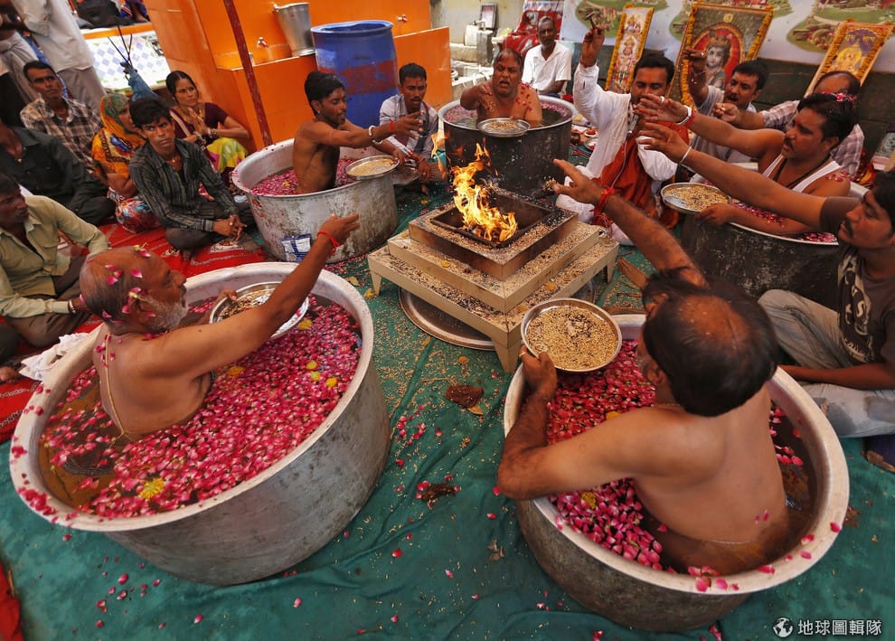 印度教的祭司們坐在大水缸中,他們正在進行一項名為Parjanya Varun Yagam的祈雨儀式。印度6月降雨低於往年平均雨量43%,這是5年來當地6月降雨最少的一次。