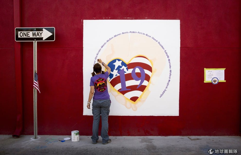 照片中的藝術家正在創作壁畫來紀念2013年時為了救火喪生的19名打火英雄。