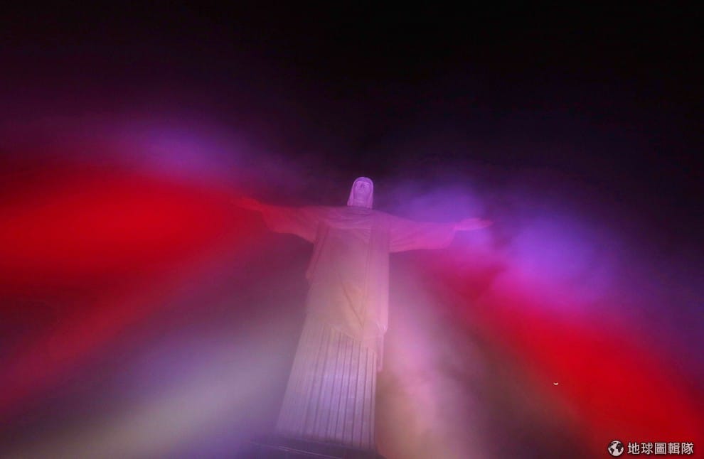 里約熱內盧的基督像附近出現加拿大國旗的顏色,7月1日這天是加拿大的國慶日。