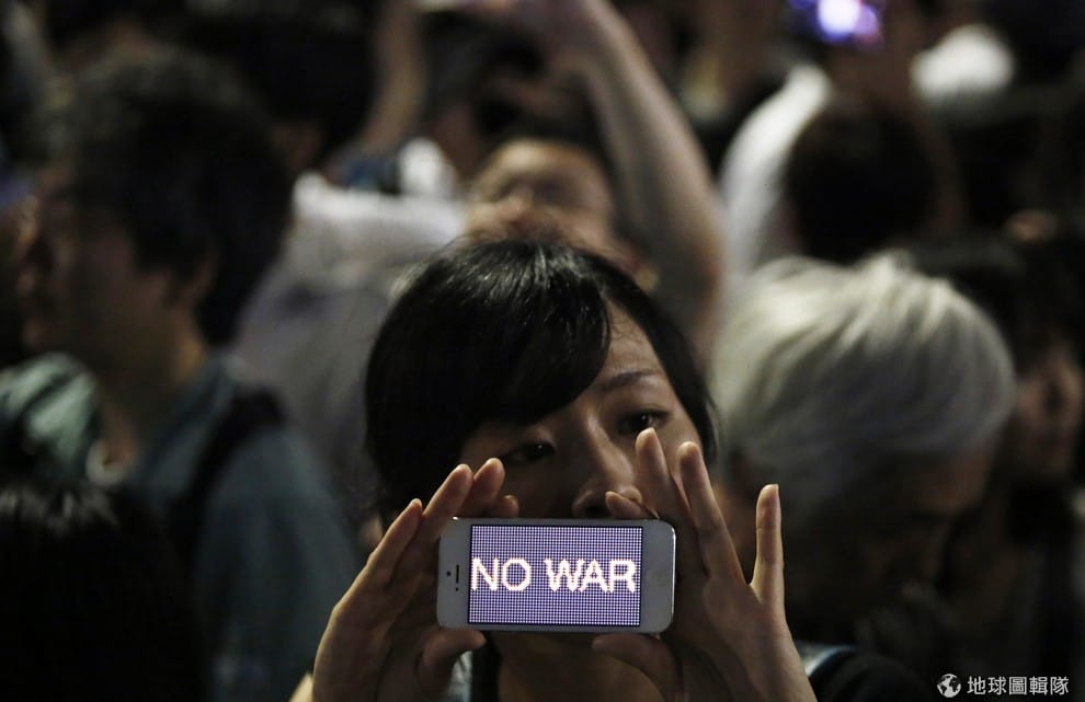 抗議安倍晉三提案讓日本可進一步出兵協防他國,安倍在東京的官邸外出現示威民眾。7月1日時,日本內閣議會決定重新解讀憲法,放寬「集體自衛權」,未來日本可以在友邦受到侵略攻擊時,出兵協防。