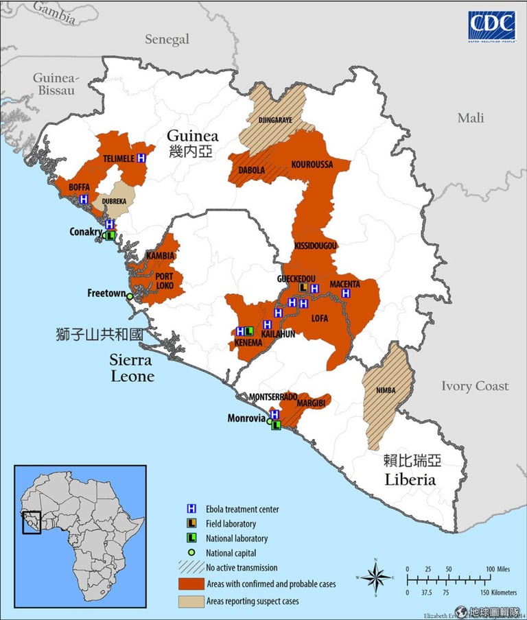 由疾病控制中心提供的圖可見西非地區的伊波拉病毒正不斷散佈開來。Photo credit: CDC