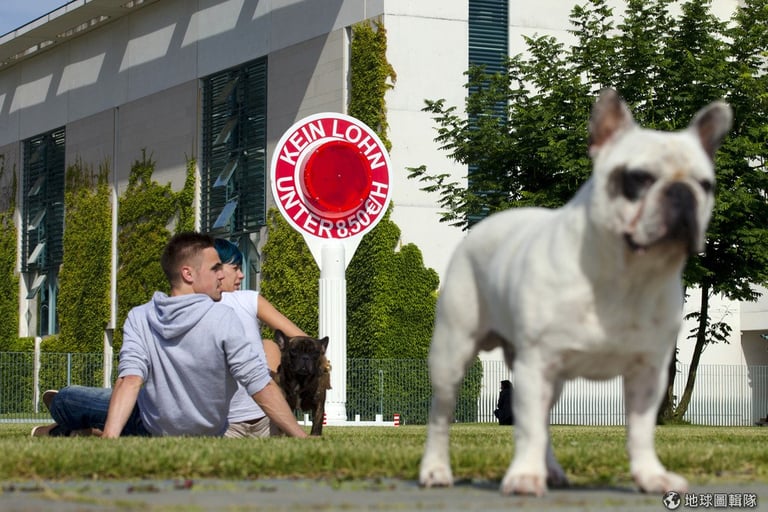 德國的柏林草地上可以看到紅色的標語,上面用德文寫著「沒有薪水該低於每小時8.5歐元」。