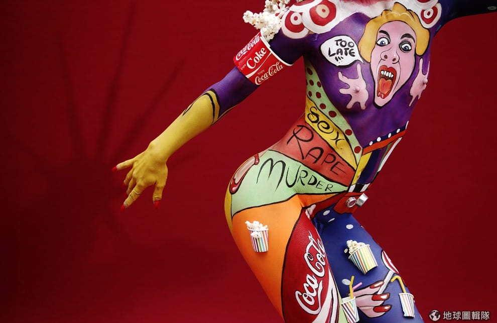 從7月4日到6日期間,奧地利的伯查赫鎮上正舉辦世界人體彩繪大賽,一名女模特兒正展現她身上的創意圖案。