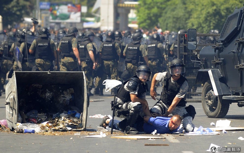 示威民眾被警察壓倒在地,當地在4號時出現2000多名的抗議群眾,他們不滿6名阿爾巴尼亞人被控謀殺和恐怖分子等罪名被判刑。