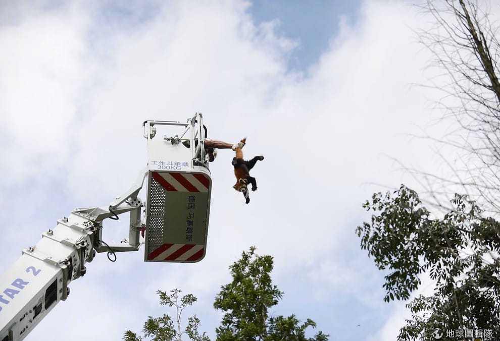 昆明市內,一名消防隊員把卡在樹上的紅貓熊抓下來。