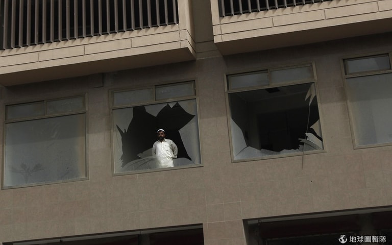 喀拉蚩市內,可見民眾站在破碎的玻璃窗後,當地在4號時傳出爆炸聲響,釀成2人不幸身亡。