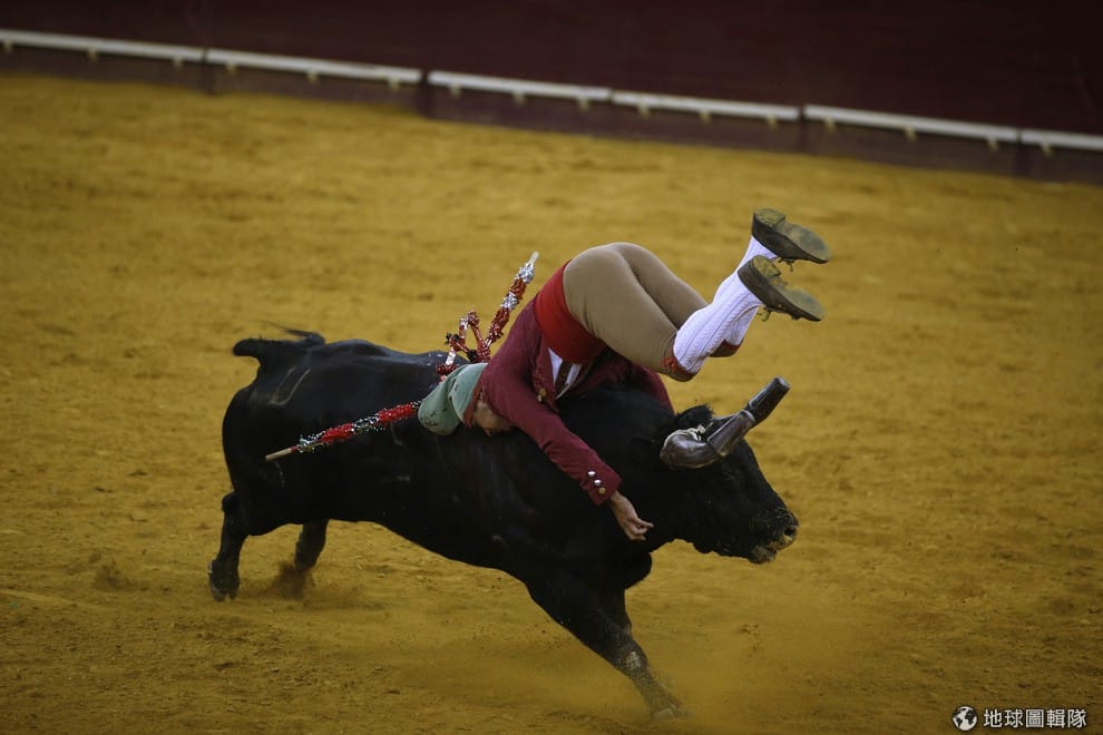 鬥牛士被公牛頂上半空中,這名鬥牛士隸屬名叫Montemor forcados的鬥牛俱樂部,他們最有名的就是只會用手去抓公牛角。