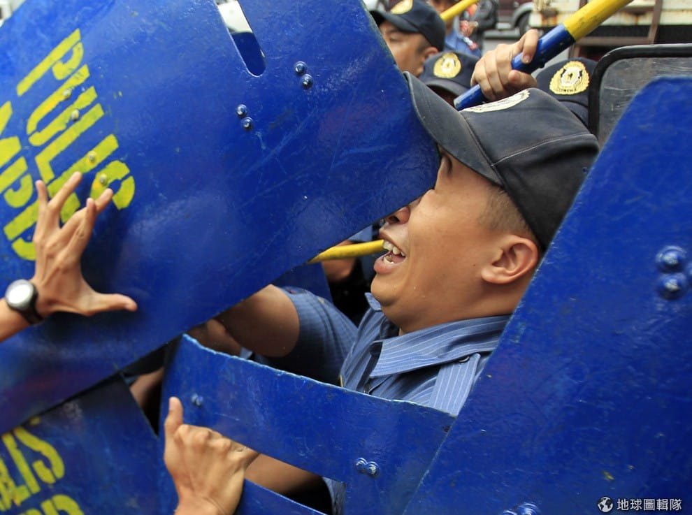 正要驅散抗議民眾的警察被自己同僚舉起的盾牌打中臉。菲律賓馬尼拉市區內,4號時出現抗議人潮,民眾要求美軍撤離菲律賓。
