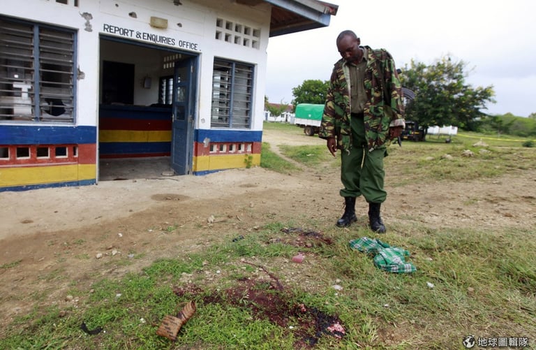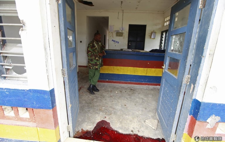 索馬利亞伊斯蘭恐怖分子血染肯亞沿岸塔那河縣的崗巴(Gamba)警局。照片中的肯亞警察站在同事前一晚才喪命的警局現場。