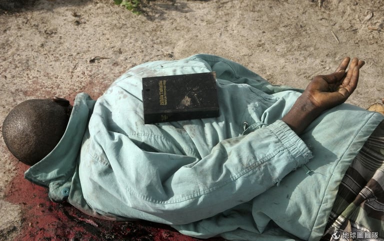 在索馬利亞恐怖份子襲擊中喪生的肯亞村民,屍體下方有大灘血跡,他的背上還被槍手放了一本聖經。