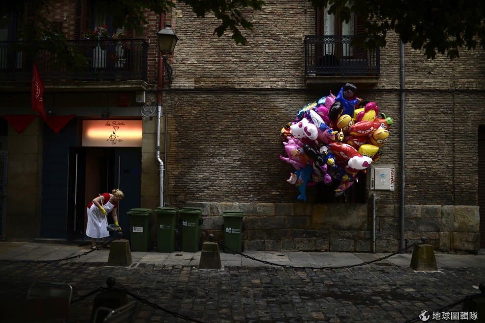 西班牙聖費爾名鎮上的居民正把留在門口的氣球拿掉,當地正是年度「奔牛節」的時期,每年此時可以見到上萬名遊客湧入這處小鎮,和居民共襄盛舉。