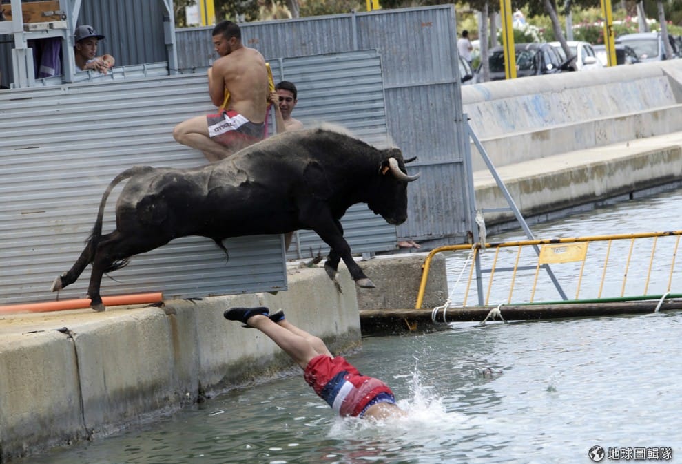 照片中的公牛把參賽者追進了海裡,西班牙的沿海小鎮丹尼雅(Denia)正舉辦有名的「奔牛入海節」(Bous a la Mar),參加活動的人會在賽道附近的遮蔽區刺激公牛來追他們,直到被追到海邊跳進海裡。