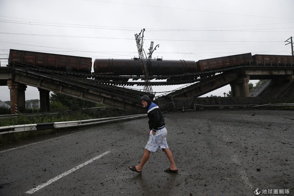 男子走過毀壞的鐵路旁,這條鐵路是通往烏克蘭東邊大城頓內次克,7號時,烏克蘭的富商站出來呼籲政府不要轟炸頓內次克,儘管該城市中有相當多的親俄派分裂分子在其中。
