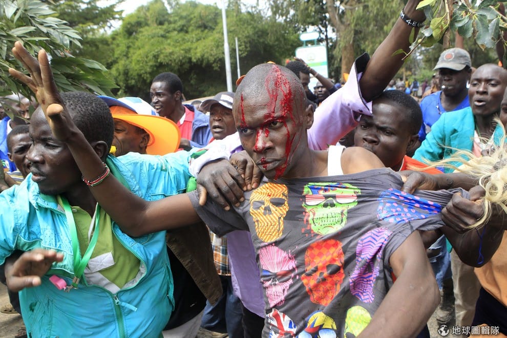 照片中支持肯亞的「民主與改革聯盟」(CORD)的民眾滿頭鮮血,他和其他人與當地警察發生衝突而受傷。