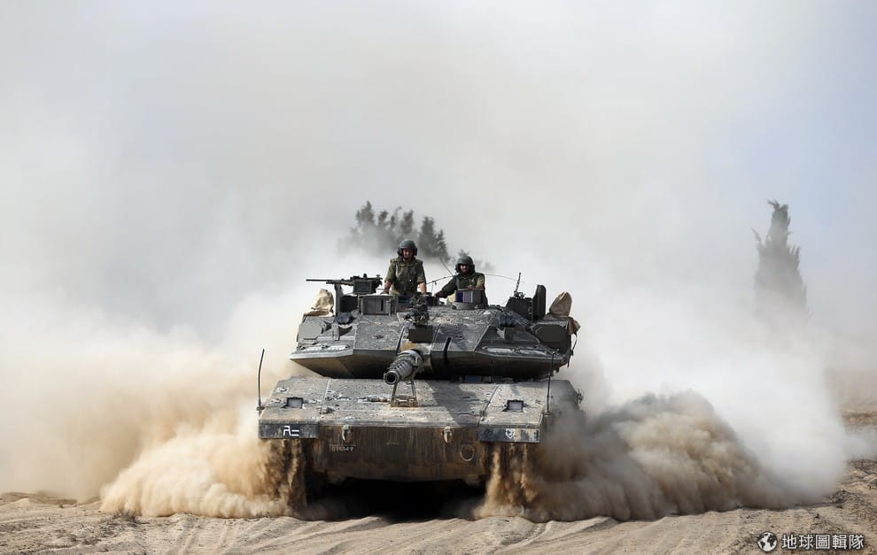 以色列軍人站在坦克車上往前行進,7號時,以色列對加薩走廊進行一系列的攻擊行動,加薩地區的伊斯蘭武裝組織就回應他們有7名軍人身亡,這也是自2012年以色列攻擊加薩走廊行動後,死傷最慘烈的一次軍事行動。