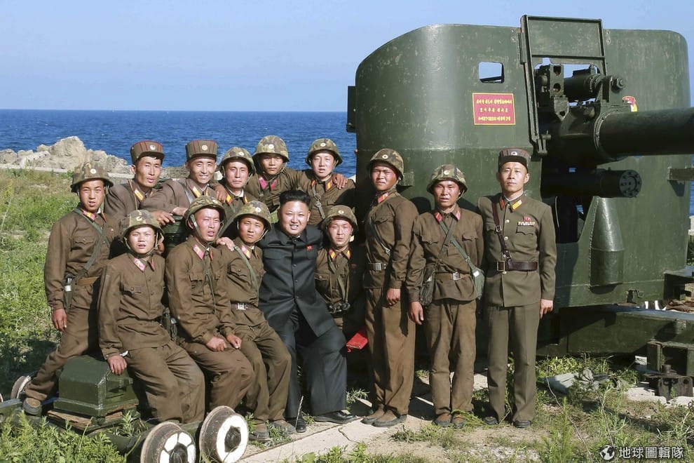 照片中的北韓領導人金正恩巡視軍事基地,和當地的軍人們合影。