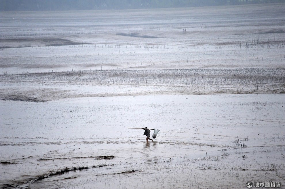 陝西省的三門峽水庫旁,可以看到一位民眾走過,當地水庫正在進行洩洪工程,但居民為了抓住被洩洪激起浮上河面的魚群,甘願冒險靠近河岸邊抓魚。