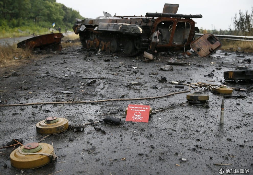 烏克蘭東邊大城斯拉維揚斯克當地,可見到毀壞的汽車和滿地的軍火遺留在地上。