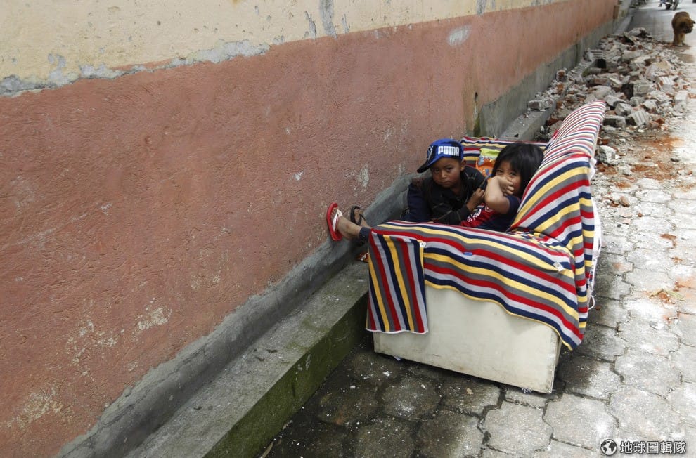 被地震夷平的半毀區中,小朋友一起擠在一張廢棄沙發上。根據報導,墨西哥南部7日晚間發生芮氏規模6.9強震,造成墨西哥與鄰國瓜地馬拉4人死亡。