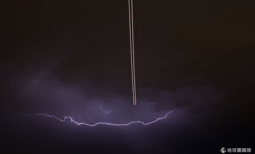 美國內華達州的夜空,閃電打下的瞬間正巧也看見一架噴射機飛過。