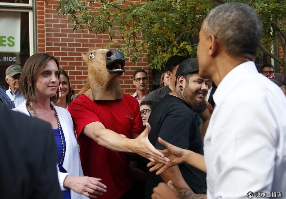 美國總統歐巴馬和頭戴馬頭的民眾打招呼,歐巴馬在8號這天到訪丹佛市參加經濟座談會。