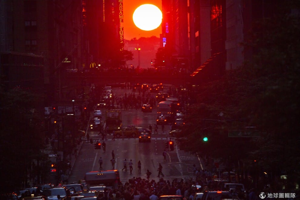 紐約市中,可以看到人們擠在42街上,因為一年僅發生兩次的「曼哈頓巨石陣」(Manhattanhenge)現身在11號這天,這個天文現象是由知名的天文學者泰森(Neil deGrasse Tyson)命名。