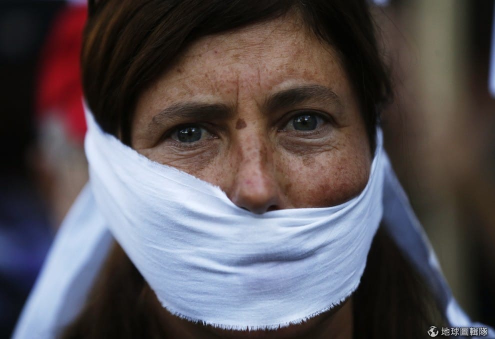 一名女性抗議政府通過的示威活動規範法條,用布條把自己的嘴巴摀住。11號這天,馬德里當地政府通過一項被受爭議的法案,未來沒有經過政府授權的集會遊行會被處以罰金。