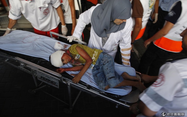 人們忙著把在以色列空襲中受傷的男孩送往醫院。
