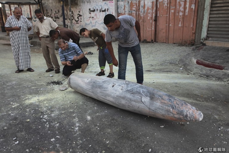 居民圍著以色列發射過來的飛彈瞧。