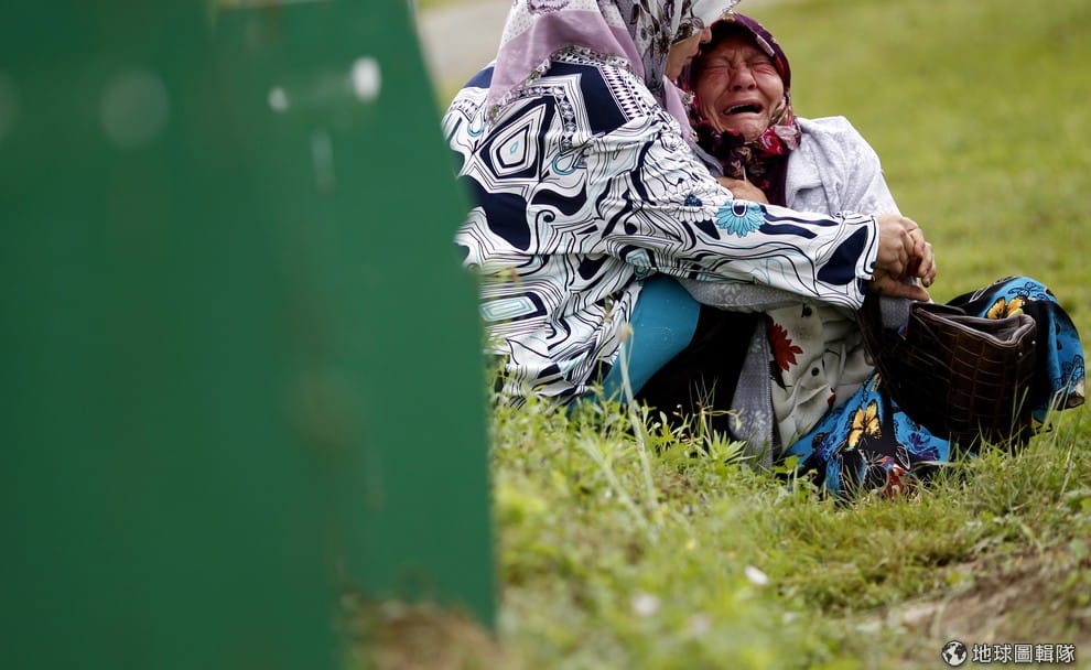 一名波士尼亞穆斯林女性看到親人的棺木時,忍不住痛哭。波士尼亞與赫賽哥維納的波多卡利(Potocari)在11號時舉辦紀念大屠殺的活動,2014年是「南斯拉夫內戰」中發生的「斯里布瑞尼卡大屠殺」(Srebrenica Genocide)滿19周年的紀念日,罹難者的家屬還有各界名流政商,都會到此地向不幸受害的罹難者們致意。今年,紀念儀式中也會把在鎮上各公墓找到且辨認出來的175具遺體下葬在紀念園區中。