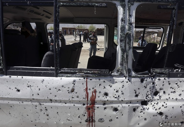 阿富汗當地員警站在被炸的車輛旁,15號時,喀布爾市區傳出汽車被路邊炸彈攻擊的消息,這場事件釀成2死5傷。