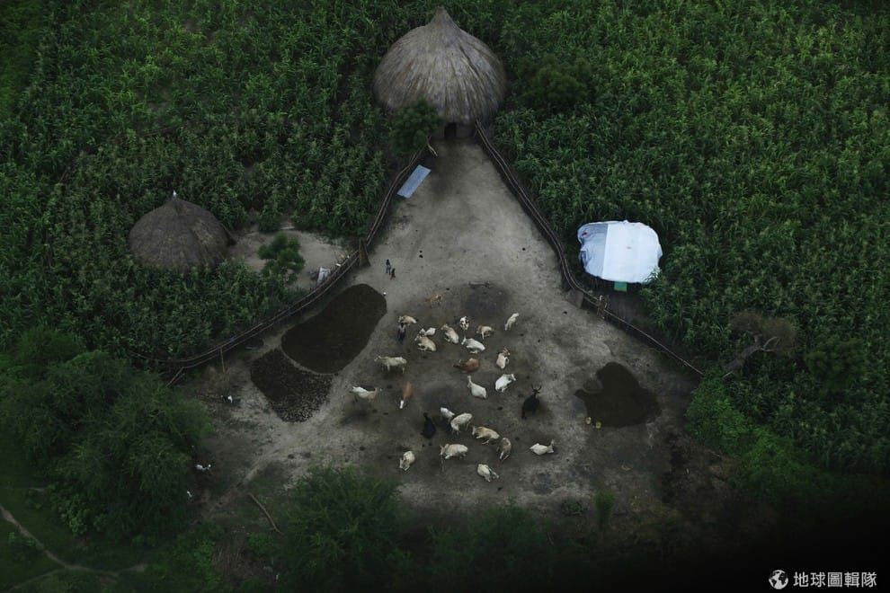 飛機往下空拍處,是南蘇丹的萊爾(Leer)居住區,根據無國界醫生組織的報導,這裡在四個月前被不知名襲擊者摧毀,目前當地有許多孩童處在營養極度不良的危急狀態。