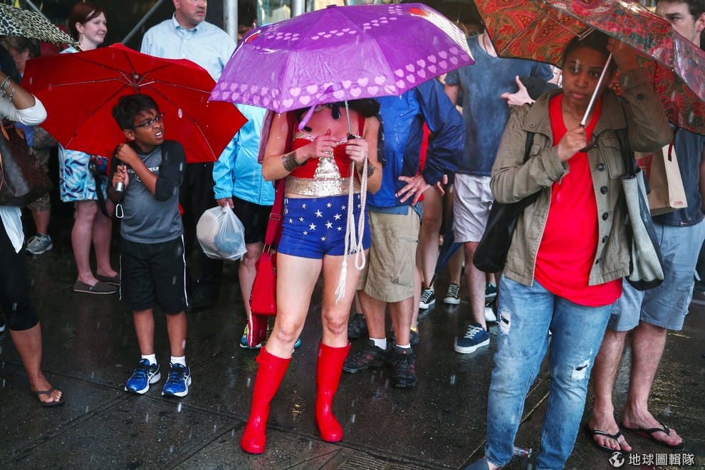 紐約市區下起豪大雨,人們躲在傘下。