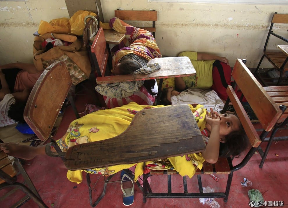 菲律賓的市政廳被改建成臨時避難所,逃難的民眾也都被帶到學校和體育館暫時避難,現場可以看到許多民眾蓋著被子躺在地上休息。