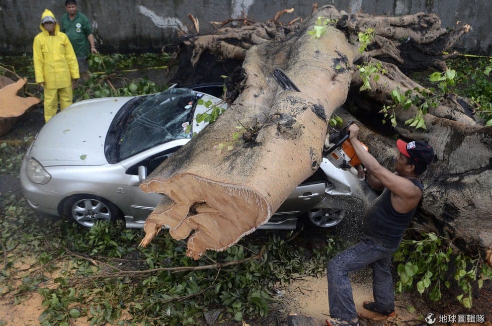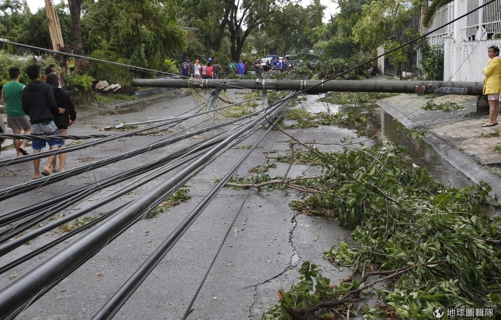強力的雷馬遜颱風讓路樹和電線杆都倒塌在地上。