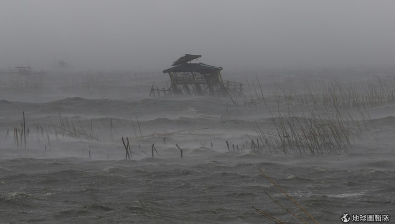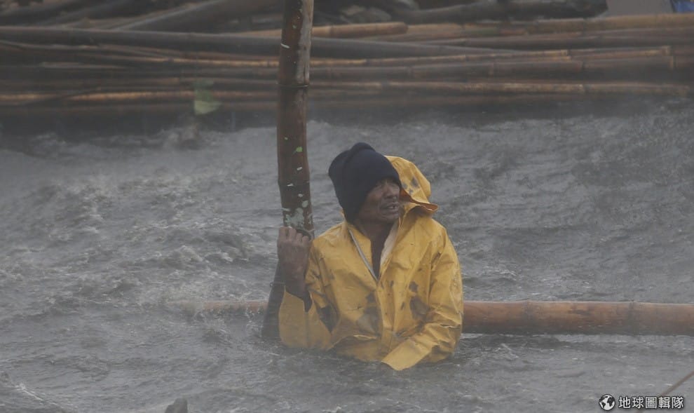 當地漁夫在暴風雨中搶救自己的魚塭。