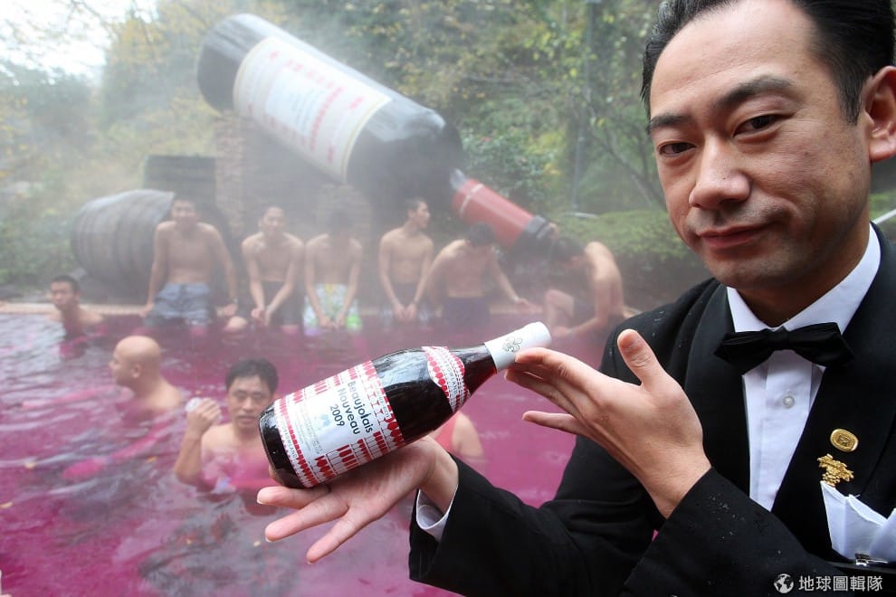 gettyimages山梨縣南部與有名的箱根非常接近,箱根溫泉每年也吸引大量的觀光客前往泡湯!照片中的品酒師拿著薄酒萊新酒,昭告大眾這邊的「葡萄酒SPA」活動開始囉!圖片來源:Koichi Kamoshida/Getty ImagesJunko Kimura/Getty Images