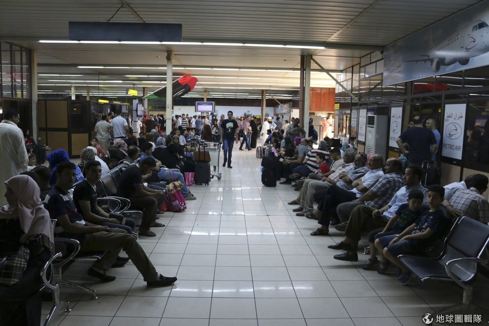 照片是等待離開利比亞的乘客。目前的黎波里國際機場已關閉,改由一個空軍基地代替。